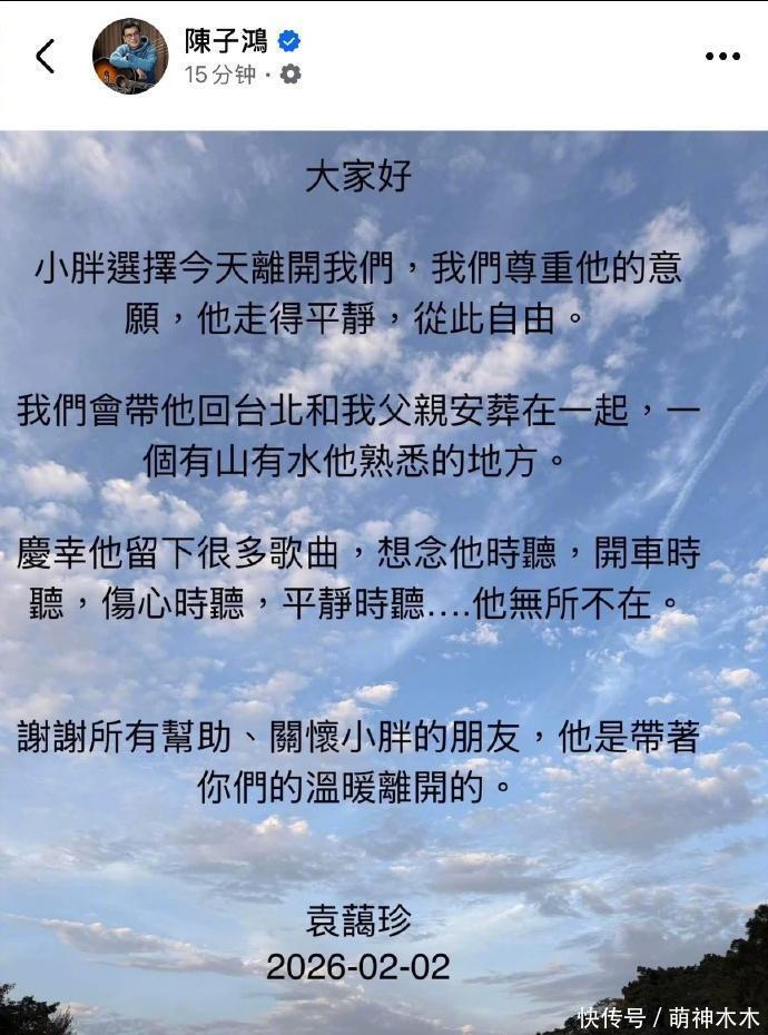 家属发布悼文,表示:“我们会带他回台北,与我父亲合葬在一起,一个有山有水、他熟悉的地方。庆幸他留下了众多歌曲,想念时听,开车时听,伤心时听,平静时听……他无处不在。” 随后,老狼也发文悼念:“R.I.P 小胖。”